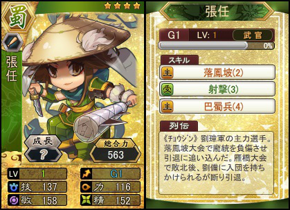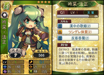 | G1 | 漢中の歌姫(2) | 試合開始時、自身より総合力の高い味方選手の力量が15+X%上昇。Xは相手の「魏」選手の数。 |