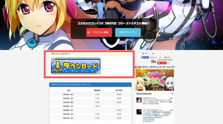 3月25日(水)17:00よりコズミックブレイク2のクローズドβテストを開始いたしました。テストに参加いただく際はクローズドβテスト用クライアントを公式ウェブサイトより、ダウンロードしインストールを行っていただきますようお願いいたします。