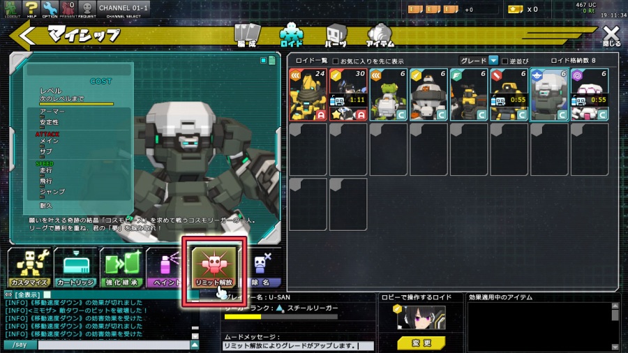 ロイドはリーグ対戦に参加するとEXPを取得してレベルアップしていきます。また、ミッションで得られるEXPアイテムを「強化継承」で使用することによってもEXPの取得が可能です。レベルアップを重ねて現在グレードの最大レベルに達すると、グレードを上げるための「リミット解放」がいくつかのアイテムを揃えることで可能になります。