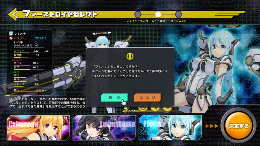 クリムローゼ、ルナスタシア、フィオナの3キャラクターのいずれかを選択します。