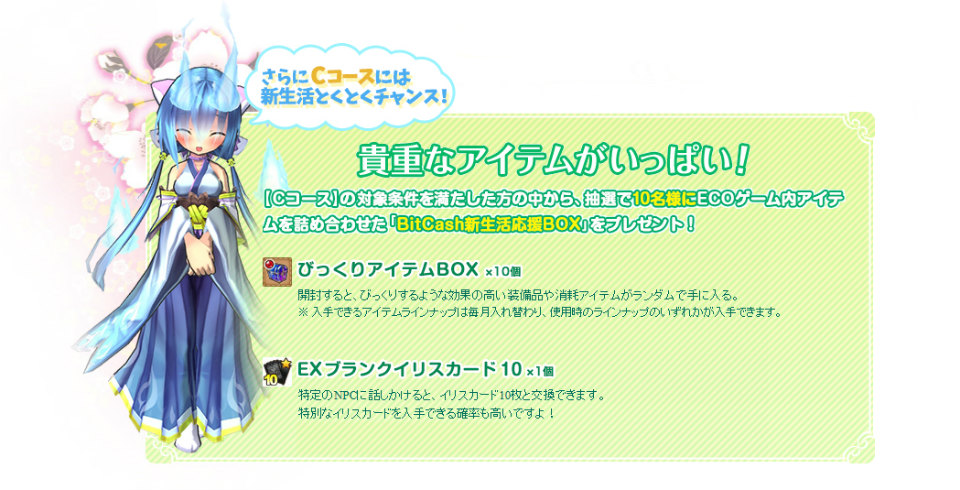 もれなくゲーム内アイテム「精霊使いの羽衣(桜)」をプレゼント。さらに、Cコースの対象となった方の中から、抽選で10名様に便利なゲーム内アイテムが詰まった「BitCash新生活応援BOX」をプレゼント。