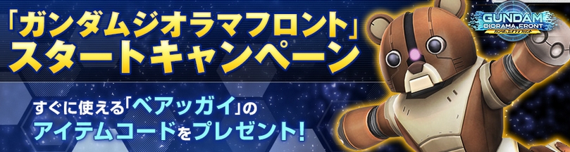 「ガンダムジオラマフロント」サービス開始記念として、ガンダムゲームポータルサイト「ガンダムパーフェクトゲームス(以下GPG)」にて連動キャンペーンが実施されます!期間中は、キャンペーンサイトで元祖“ベアッガイ”を入手できるシリアルコードをGETできます(※GPG会員登録が必要)。
