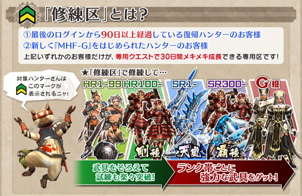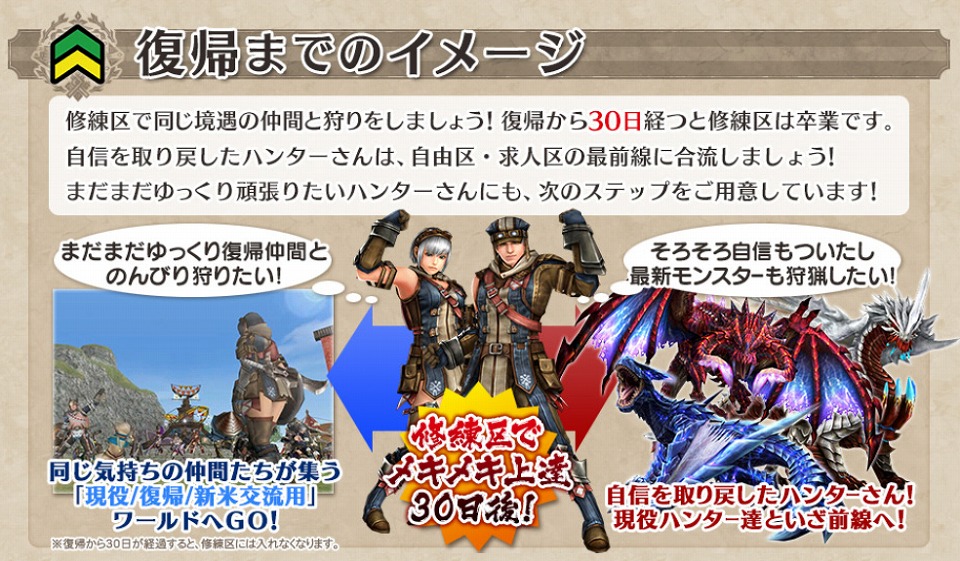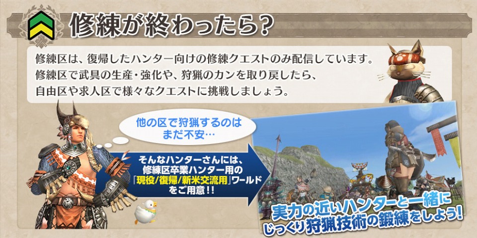 本日より復帰ハンターを強力サポートする新たな区「修練区」を実装いたします。自分のペースで、ハンターランクポイントやゼニーを効率よく稼ぐことができ、強力な武具の専用素材を手にいれることができる「修練クエスト」で、狩猟のカンを取り戻しましょう!