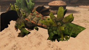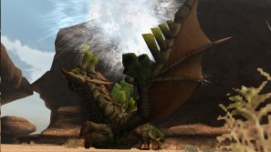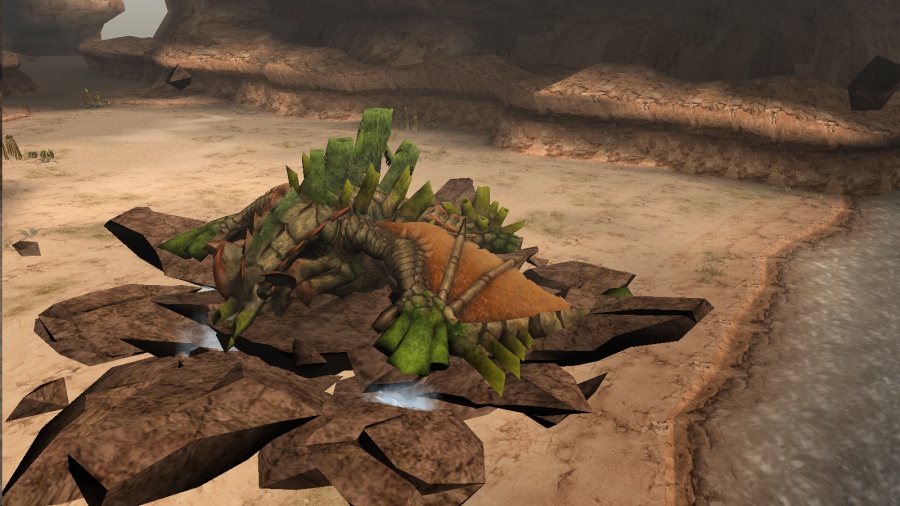 水砦竜の異名をもつ「グレアドモス」。太古から砂漠に生息していたといわれている。その昔、砂漠はオアシスのある豊かな地だったが、干ばつが続き、個体の多くが離れていった。砂漠に残った個体は地底湖へと棲み処を移し、太古の姿をそのままに、今の時代まで命を繋いできた。そして近年、地底湖の水が少なくなってきたため、水を求めて地上へと再び姿を現した。