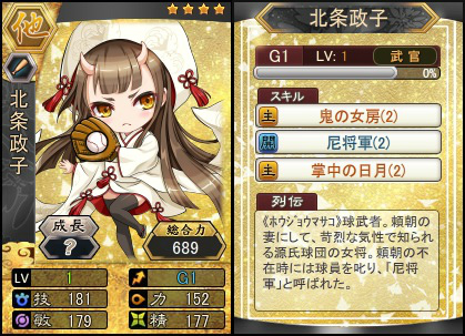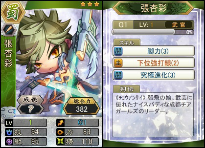 | G1 | 脚力(3) | 試合開始時、自身の敏捷が36%上昇。試合終了まで持続。 |