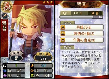 | G1 | 丹陽兵(3) | 「呉」の選手がチーム内に5人以上いる時、15%の確率で一塁打を打つ。 |