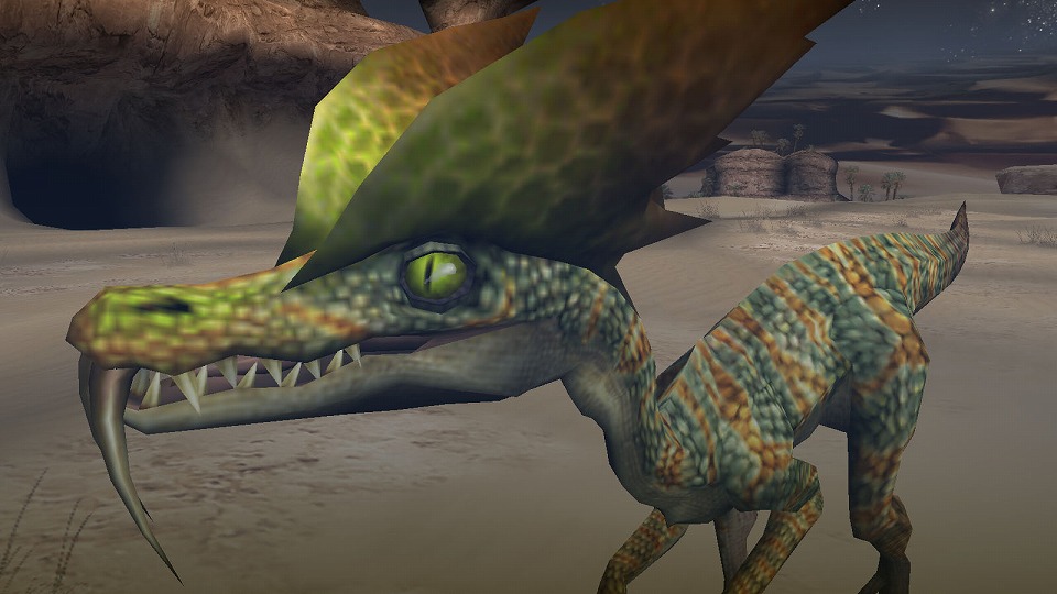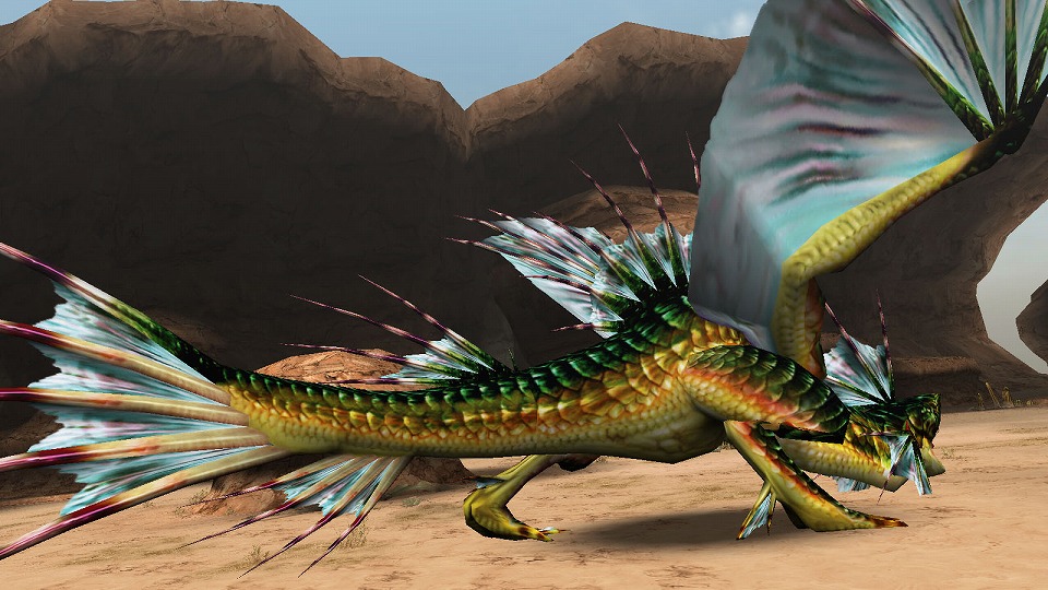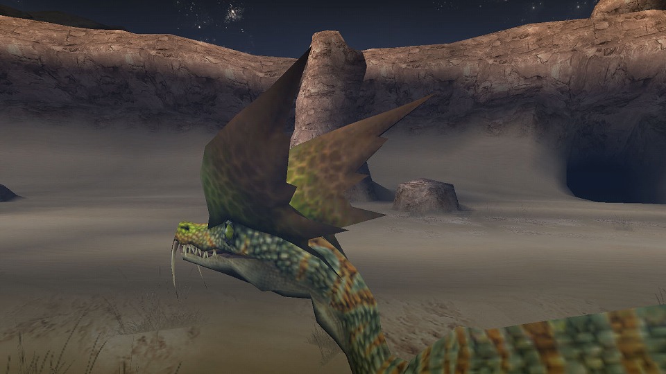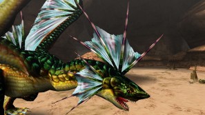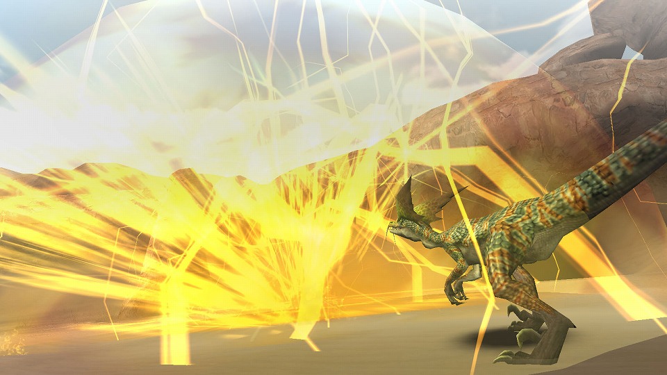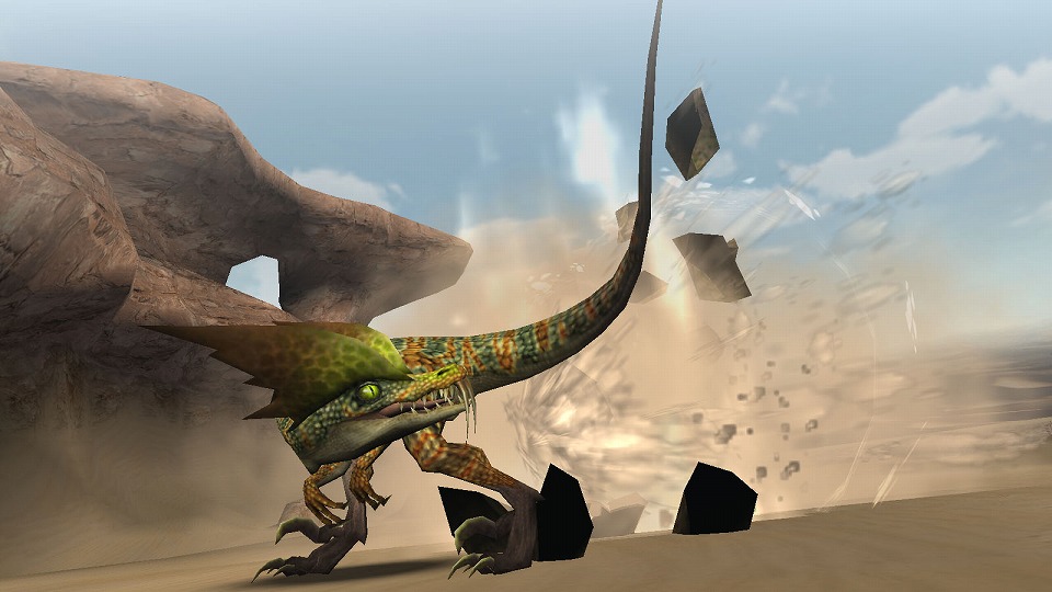 | 素早く回り込んで砂飛ばし!死角を狙って急襲する、ドスゲネポスの狡猾さは健在だ。 | |