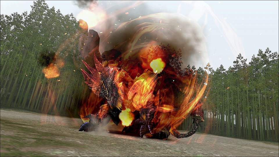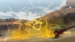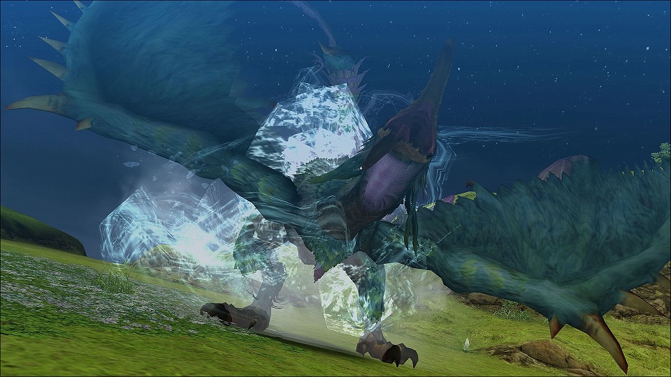 | 上空に向かって吐き出された水が落下して破裂!その飛沫はガノトトス亜種を中心に全方位へ拡散する。 | |