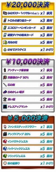 2015年4月9日(木)のメンテナンス終了後から2015年4月30日(木)メンテナンス開始前までの間、一度に5000円以上の課金決済をされた方に素敵なプレゼントを致しております。