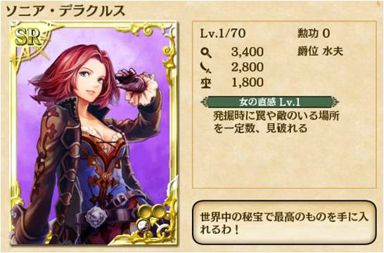 SRランクの希少な航海士カード。発掘モード開始時に仕掛けられた罠の場所を見抜けるレアスキル、「女の直感」を持っています。