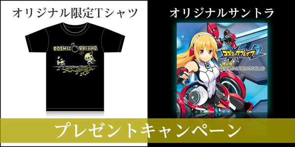 4月30日(木)から5月31日(日)までのキャンペーン期間中のRtご購入金額に応じて「コズミックブレイク2」に登場するキャラクタ「クリムローゼ」がデザインされた「オリジナル限定Tシャツ:クリムローゼ」と最先端の音楽作曲を行っているスーパースィープが作曲した「オリジナルサウンドトラック:スーパースィープ」をもれなくプレゼントさせていただきます。