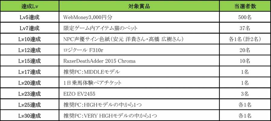各Lvに達成し、特設サイトのアンケートに回答いただくと、抽選で、推奨PCや、WebMoneyなど豪華賞品をプレゼントいたします。