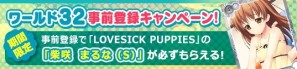 期間中ワールド32に事前登録していただいた方全員に、「LOVESICK PUPPIES」の「柴咲まるな(S)」をプレゼント!ゲーム登録後に自動で配布されます。