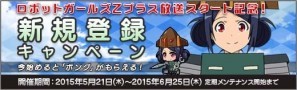 2015年5月21日(木)定期メンテナンス後から、新規登録キャンペーンを実施いたします。キャンペーン期間中、UJJ会員登録を行い「ロボットガールズZ ONLINE」をアクティブ化してくれた方に「ボング」や「改造チケット☆5」などを獲得できる「新規応援ボックス」をプレゼント!