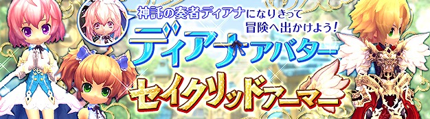 6月4日(木)の定期メンテナンス後より、パーラシアの女神ディアナになりきれる衣装「ディアナアバター」と、騎士が好む神聖な鎧衣装「セイクリッドアーマー」ほか、大きな二つのリボンがかわいい「ファンシーリボン」がアイテムモールに新登場しました。