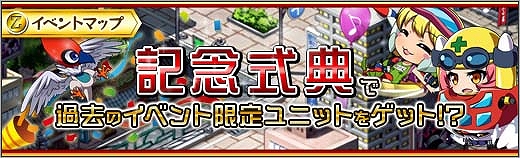 2015年6月11日(木)定期メンテナンスにて、イベントマップ「記念式典」を更新いたしました。更新後のイベントマップでは、クリアすると稀にイベントアイテム「懐かしい部品」が手に入ります。「懐かしい部品」を一定数集めると、過去のイベントユニット「ゲッちゃん 3」「スカイラー」「グリーンバラたん」を獲得できますので、ぜひこの機会を逃さないでくださいね♪