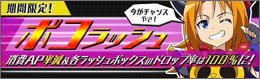 2015年6月11日(木)定期メンテナンス後から、「ボコラッシュキャンペーン」を実施いたします。期間中、「ボコラッシュ」ステージクリア時に獲得できる「ラッシュボックス」」のドロップ確率が 100%になります。さらに消費 AP が通常の半分になっているので、この機会に挑戦してくださいね♪