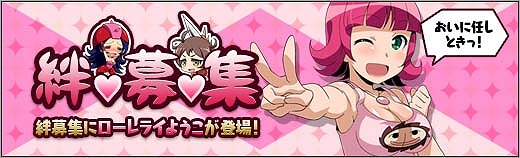 2015年6月11日(木)定期メンテナンスにて、「絆募集」の内容を更新いたしました。更新期間中は、「ライガ様」「トリプルガイちゃん」など「ロボコイン募集」でしか出現しないユニットが登場!さらに、今回は「ローレライようこ」も登場し、「絆募集」では初となる【EX】シリーズが入手可能です。今だけ「絆募集」は一日1回無料で挑戦できますので、この機会にぜひお気に入りのユニットを手に入れてくださいね。