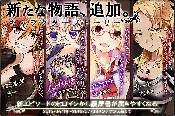 6月19日(金)メンテナンス後から7月3日(金)メンテナンス前まで、キャラクターストーリーに新しくエピソードが追加された社員4人からの履歴書が届きやすくなります。履歴書が届きやすくなる社員は「ロミルダ」、「カーヤ」、「アウロラ」、「アンナリーナ」の4人です。毎日ログイン時に届く履歴書に上記社員からの履歴書が入っていることもあります。