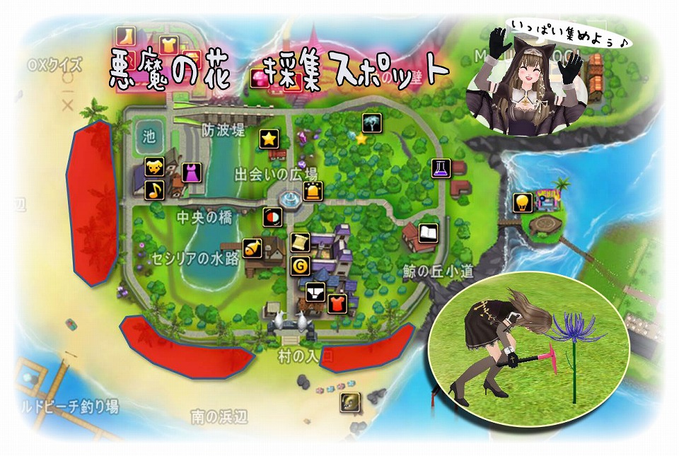 海沿い付近に「ミニデビルフラワー」が咲き始め、採集ができるようになりました。ピンク色の「魔法のシャベル」を装備して、採集しましょう。