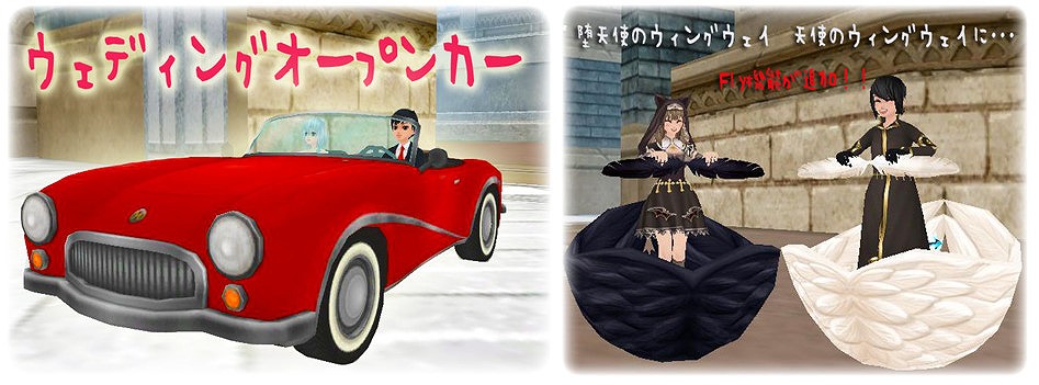 結婚式のハネムーンにうってつけの「ウェディングオープンカー」が新登場です。また、人気の「天使のウィングウェイ」と「堕天使のウィングウェイ」に、空を駆けることができる待望のFly機能が搭載されました。
