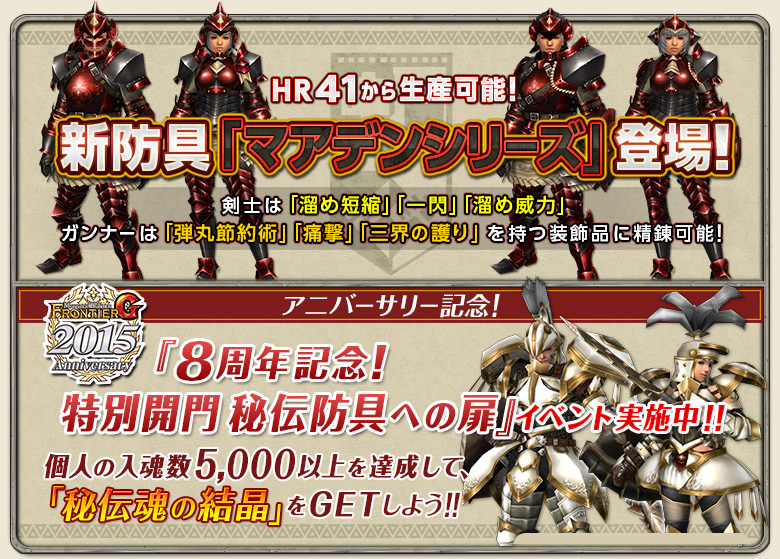 秘伝開門の鍵【西門】(片手剣) を所持することで「秘伝魂の結晶」1個をプレゼント!また、第87回「狩人祭」では、勝ち組褒賞として新防具「マアデンシリーズ」が登場いたします。「マアデンシリーズ」はハンターランク41から生産可能でG級防具まで強化することができ、G級装飾品に精錬することも可能です。狩人祭に参加して豪華な褒賞を手に入れよう!