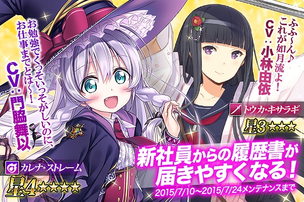 期間限定で履歴書からの新社員出現率がアップするキャンペーンを実施いたします。キャンペーン期間中は、新社員「カレナ・ストレーム」「トウカ・キサラギ」2人から履歴書が届きやすくなります。毎日ログイン時に届く履歴書に新社員からの履歴書が入っていることもあります。