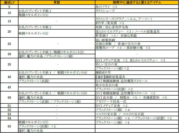 ※達成条件のレベルと報酬はそのレベルに達している時点でもらえるアイテムをまとめています。