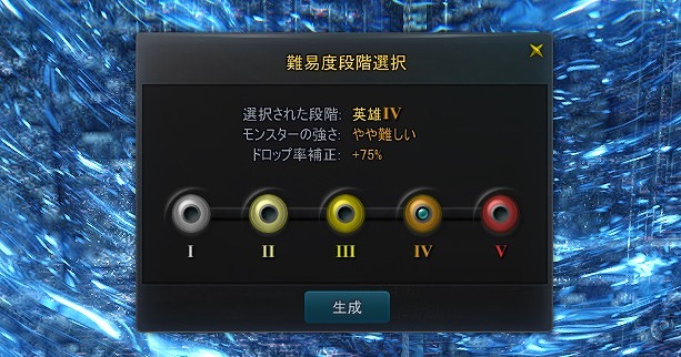 精鋭・英雄ダンジョン選択時に、さらに5段階の難易度を設定できるシステムです。選択した難易度に応じて、アイテムドロップ率が向上しますが、代償として出現モンスターが強力になります。