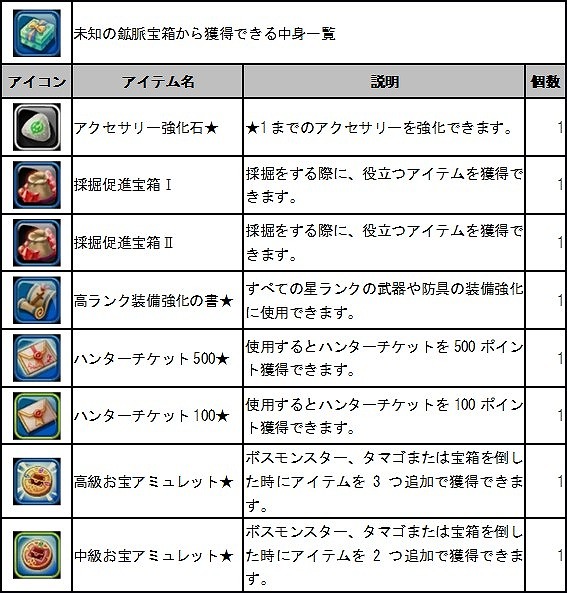 報酬アイテム「未知の鉱脈宝箱」から獲得できるアイテム一覧