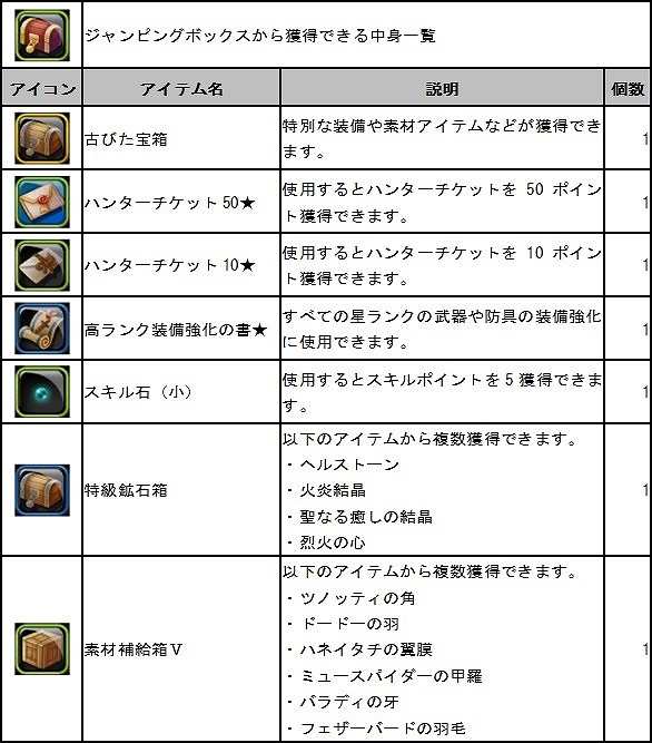 報酬アイテム「ジャンピングボックス」から獲得できるアイテム一覧
