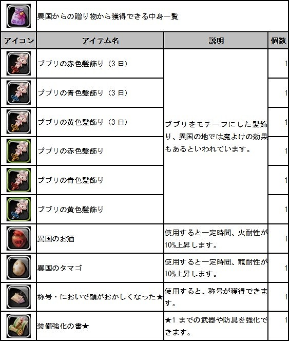 報酬アイテム「異国からの贈り物」から獲得できるアイテム一覧