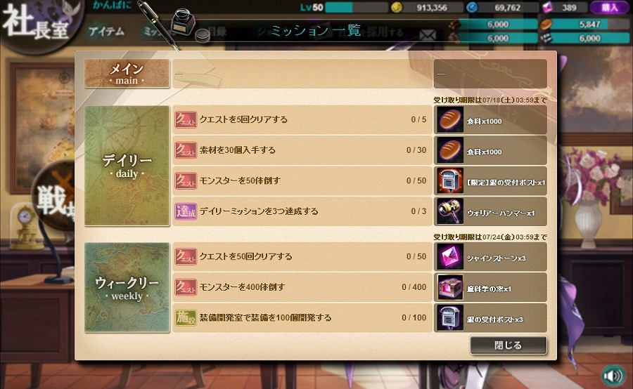 さらに、キャンペーン期間中はメインクエストでレアなアイテムが入手できるようになります!キャラクターの育成に便利な「経験値の館 招待券」、装備開発に使える3種類のハンマー、人気アイテム「銀の受付ポスト」などが登場します。