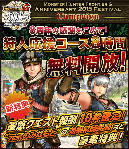 「MHF-G Anniversary 2015」キャンペーンのひとつとして「狩人応援コース無料開放キャンペーン」を開催いたします。8周年の感謝をこめて、狩りを強力にサポートする「狩人応援コース」を8時間無料開放!存分に狩りをお楽しみください!