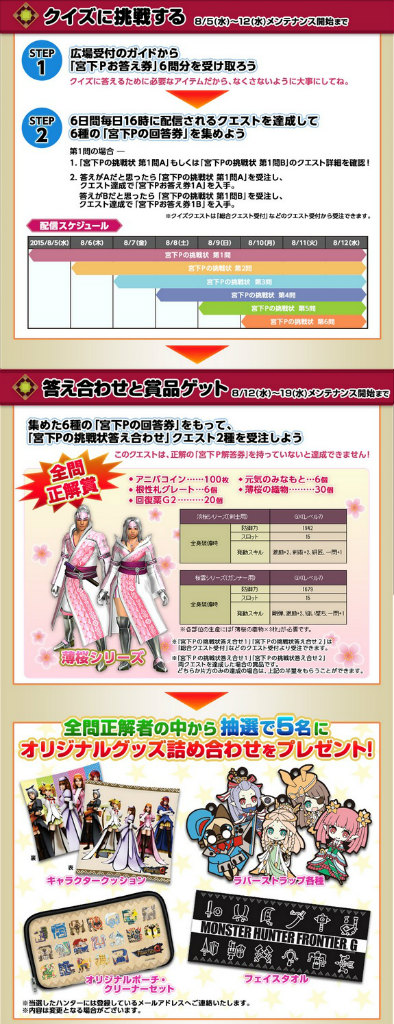 ハンターのみなさん こんにちは!宮下です。「MHF-G」も8周年を迎えることができました(やったー♪)そんなアニバーサリーにふさわしい、みなさんに楽しんでもらえる催しっていうことで、「クイズ大会!」やりますよ~(*