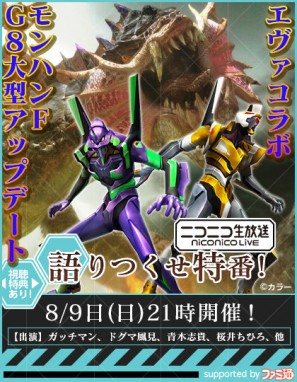 7月22日(水)の大型アップデート「G8」で実装された新モンスター「ガスラバズラ」や「ジンオウガ」の実況プレイ、「ヱヴァンゲリヲン新劇場版」コラボの紹介、視聴者参加アンケートやMHF-G開発運営陣の一問一答、など必見の内容でお送りするニコ生特番!(エヴァ芸も飛び出す!?)番組をご覧いただいた全視聴者には、ゲーム内で使える豪華特典もご用意!