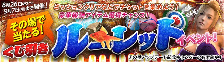 8月26日(水)0:00より豪華くじ引きルーレットイベントを開催いたします。ミッションのクリアやログインなどさまざまな条件を達成し、獲得した「くじ引きチケット」を使用してルーレットを回すと、報酬アイテムを受け取れます。