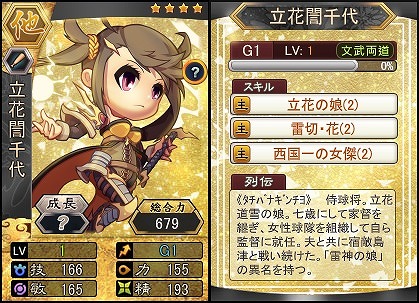 雷神の衣鉢を継いだ愛娘、立花の城は私が守る!完全堅守の女城主、雷切を携えここに参戦!