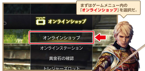 ゲームメニューの一番右にある「オンラインショップ」を選択します。