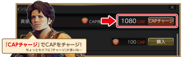 黄金石のご購入には、カプコンオンラインゲームズの独自通貨となる「CAP」が必要です。CAPのチャージは、DDONゲーム内から行えるほか、COGポータルサイトよりパソコン、スマートフォンからも行うことができます。