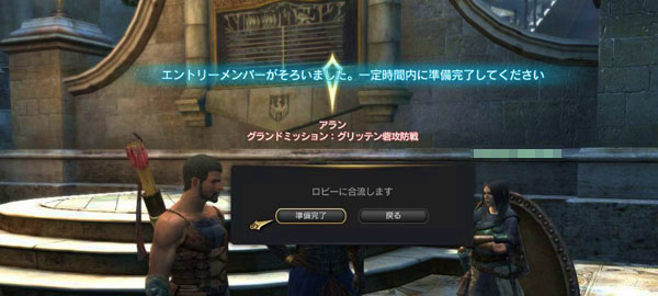 募集、または参加したエントリーボードに8人のメンバーが揃うと画面中央にメッセージが表示されます。一定時間内に以下の手順で「準備完了」を選択しましょう。