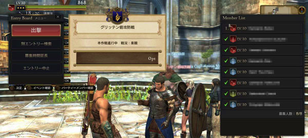 参加する8人全員が「出撃」を選択すると、「グリッテン砦攻防戦」が開始します。「出撃」を選択後、画面右側に表示される参加者全員にチェックがつくまで、エントリーボードは開いたまま待機しましょう。