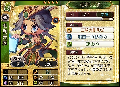 試合開始時、味方チーム内の「蜀」選手が相手より多いと、味方「蜀」選手の全能力が10%上昇し、相手「蜀」選手の全能力が10%低下。