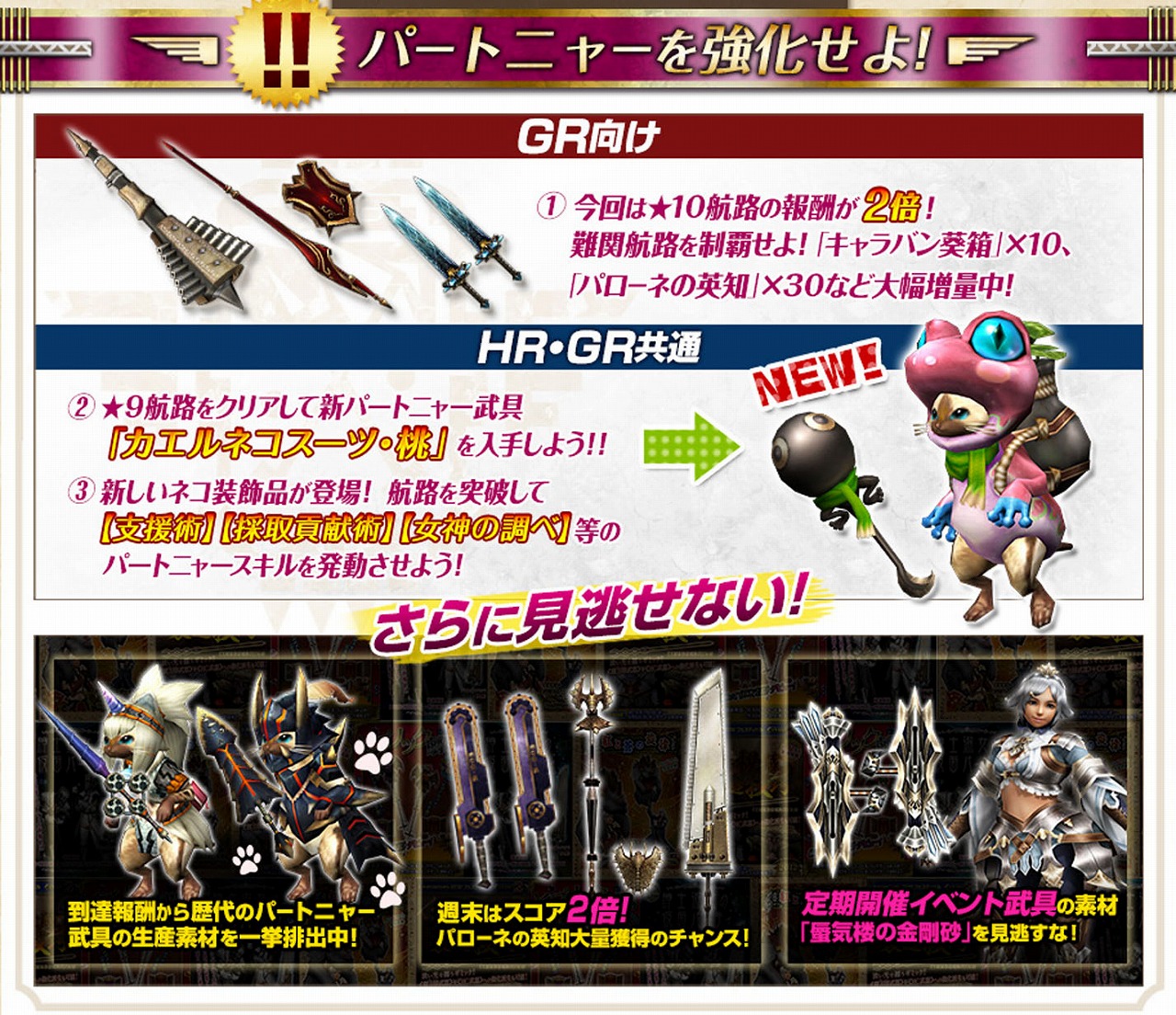 週末限定★9航路を(HR17~)クリアして、「パローネ大航祭」でしか手に入らない新たなパートニャー武具をゲット!航路突破報酬で、新しいネコ装飾品の素材を入手可能!航路を突破して【支援術】【採取貢献術】【女神の調べ】等のパートニャースキルを発動させよう!