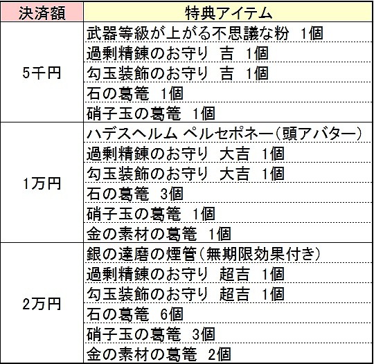 本キャンペーンの葛篭に入っているアイテムは下記の通りです。