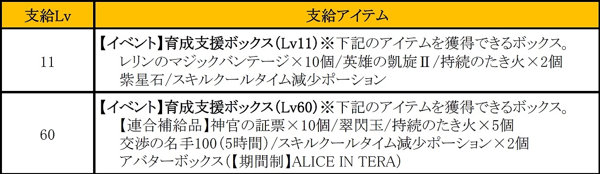イベント期間中、特定のLvに到達するとメールで「育成支援ボックス」が支給されます。ボックスからは支給時のLvに合わせて、育成に役立つアイテムを獲得できます。