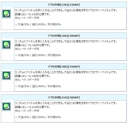 2015年9月10日(木)定期メンテナンスにて、エンジェルモールに反射性能を持った強力なアクセが手に入る「アクセの卵」が期間限定で再登場いたしました。「アクセの卵」からはレベル130、160、180、210の卵が4種で1週間限定販売となります。