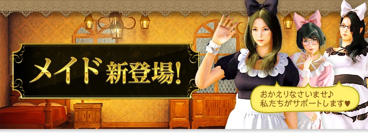 「メイド」は、「べリア」・「ハイデル」・「カルフェオン」・「アルティノ」といった主な街の住居地にて、家具と同じように配置することで、その街の倉庫または取引所を、該当の領地内ならばどこからでも20分間に1回利用することができるようになります。なお、「メイド」は、[倉庫管理メイド][取引管理メイド]の2種類が存在し、外見もそれぞれ3種類ずつ(計6種類)が用意されており、パール商店で便利アイテムとして交換することができます。
