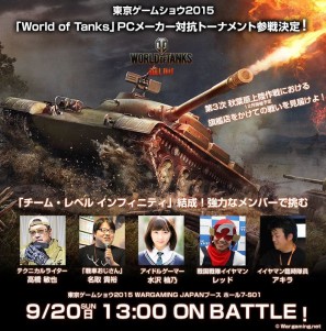 20万人を超える来場者が予想され、9月17日から幕張メッセで開催される「東京ゲームショウ2015」。この中で行われるイベント「『World of Tanks』PCメーカー対抗トーナメント」に、強力メンバーを結集させ「チーム・レベル インフィニティ」として参戦いたします。