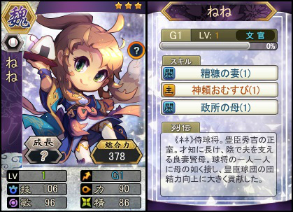 試合開始時、相手チームで最も多い選手の国が「魏」以外だと、味方の「魏」選手の全能力が6%上昇。試合終了まで持続。